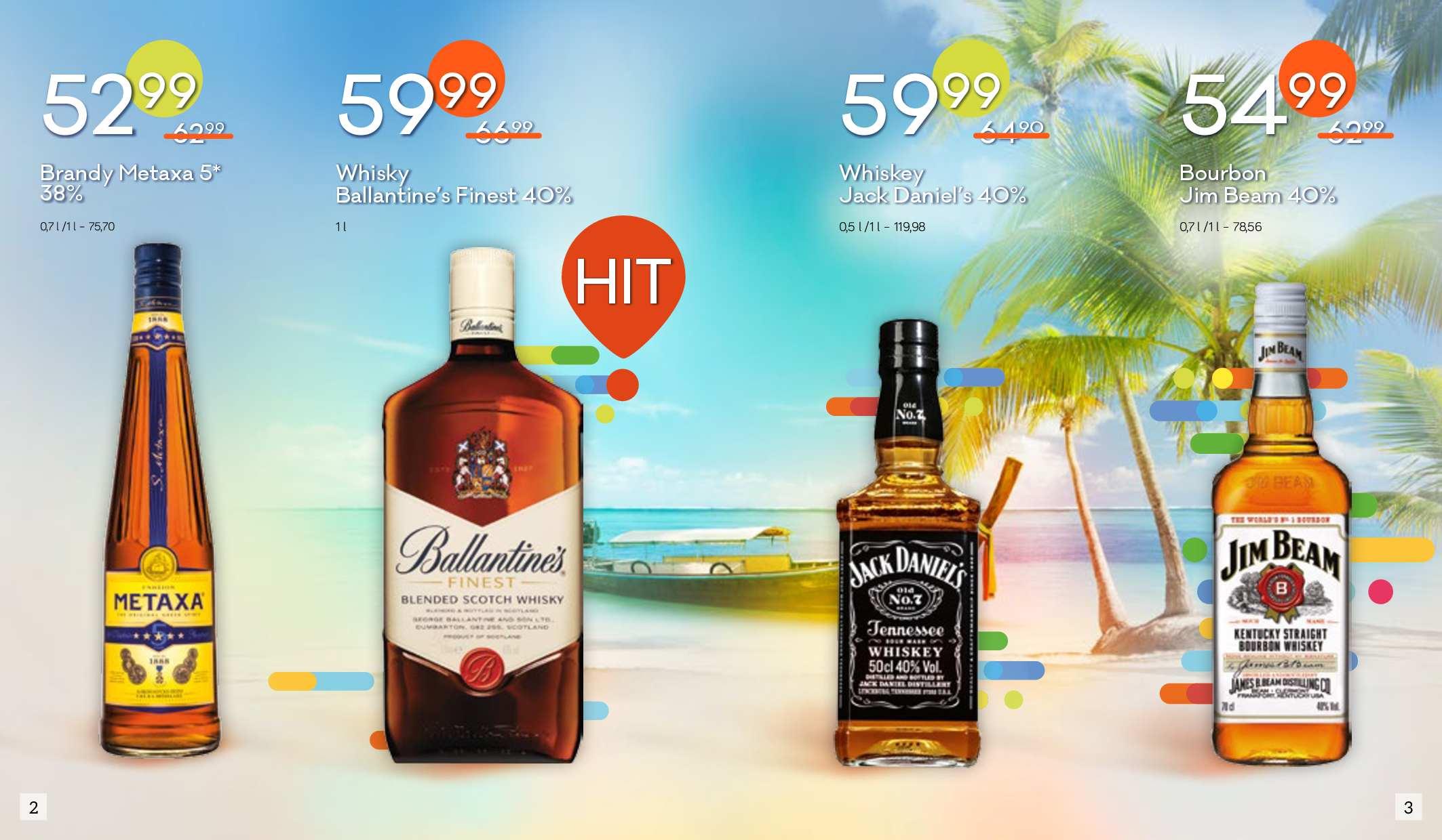 Metaxa brandy, Jim Beam burbon, Ballantine's whisky, Jack Daniel's whisky